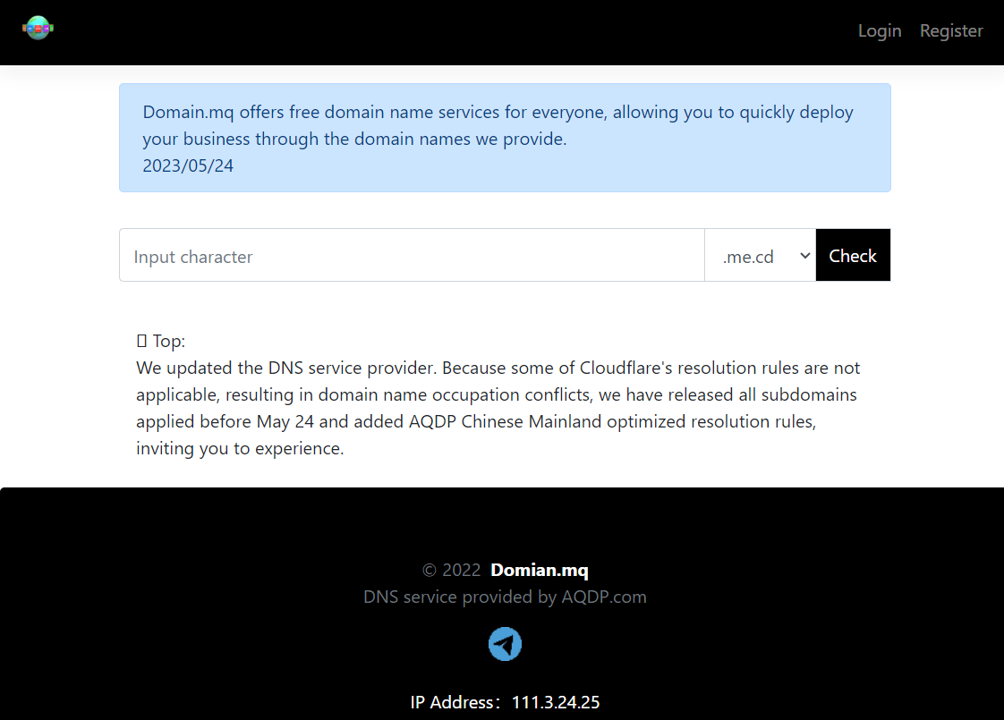 Domain.mq提供免费二级域名 发表于 2023-07-14 分类于 免费资源 阅读次数: Domain.mq为大家提供免费域名服务,让您通过Domain.mq提供的域名快速部署您的业务,有多种后缀,如me.cd,支持A记录和CNAME记录,需要使用邮箱注册。 注册地址:https://domain.mq/