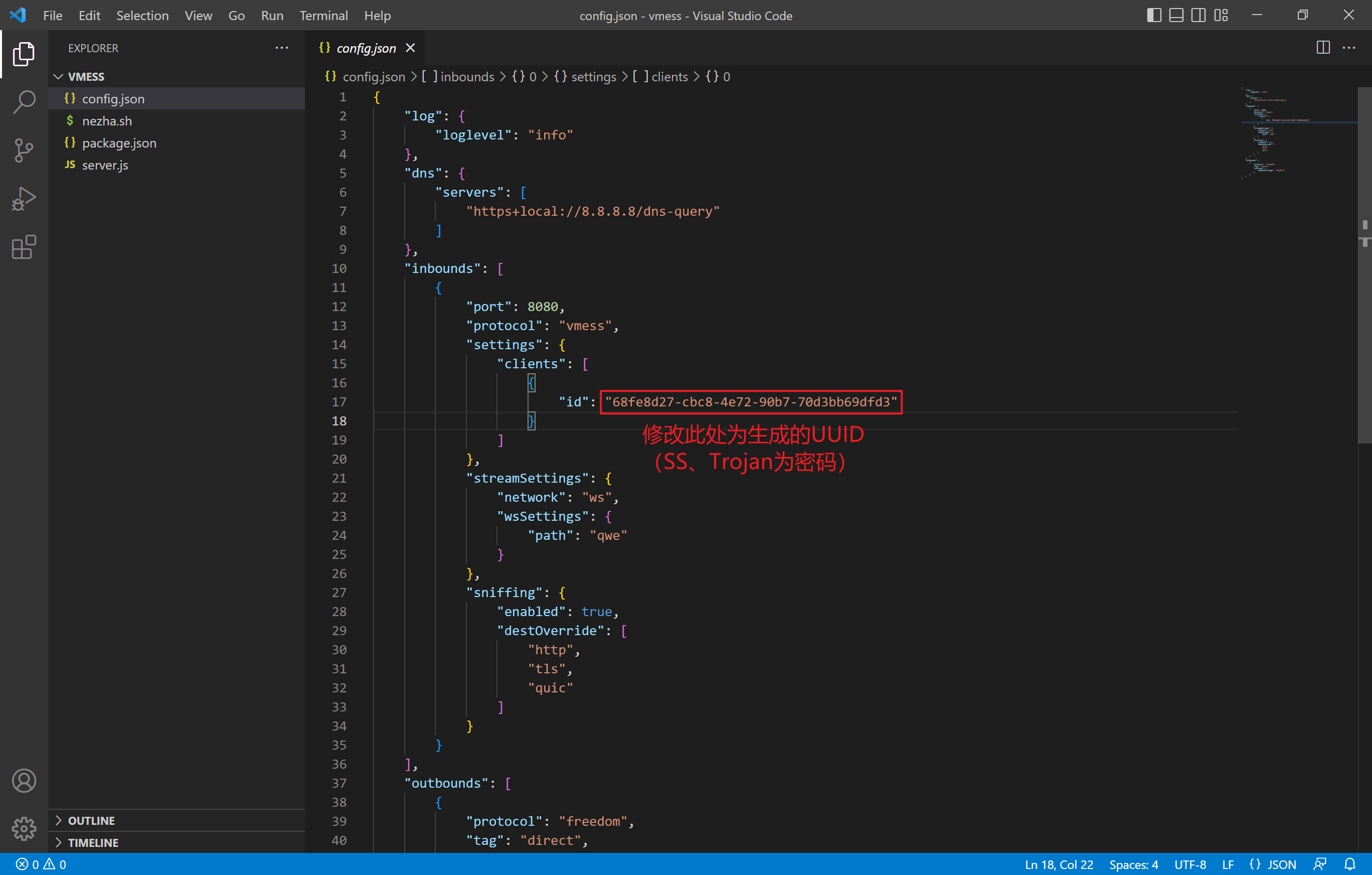3.编辑config.json文件,修改第17行(新项目为14行)的UUID(如为老项目的SS、Trojan协议则为密码)。【仅限新项目:如需修改ws路径请选中协议的路径,使用Ctrl+H进行替换】