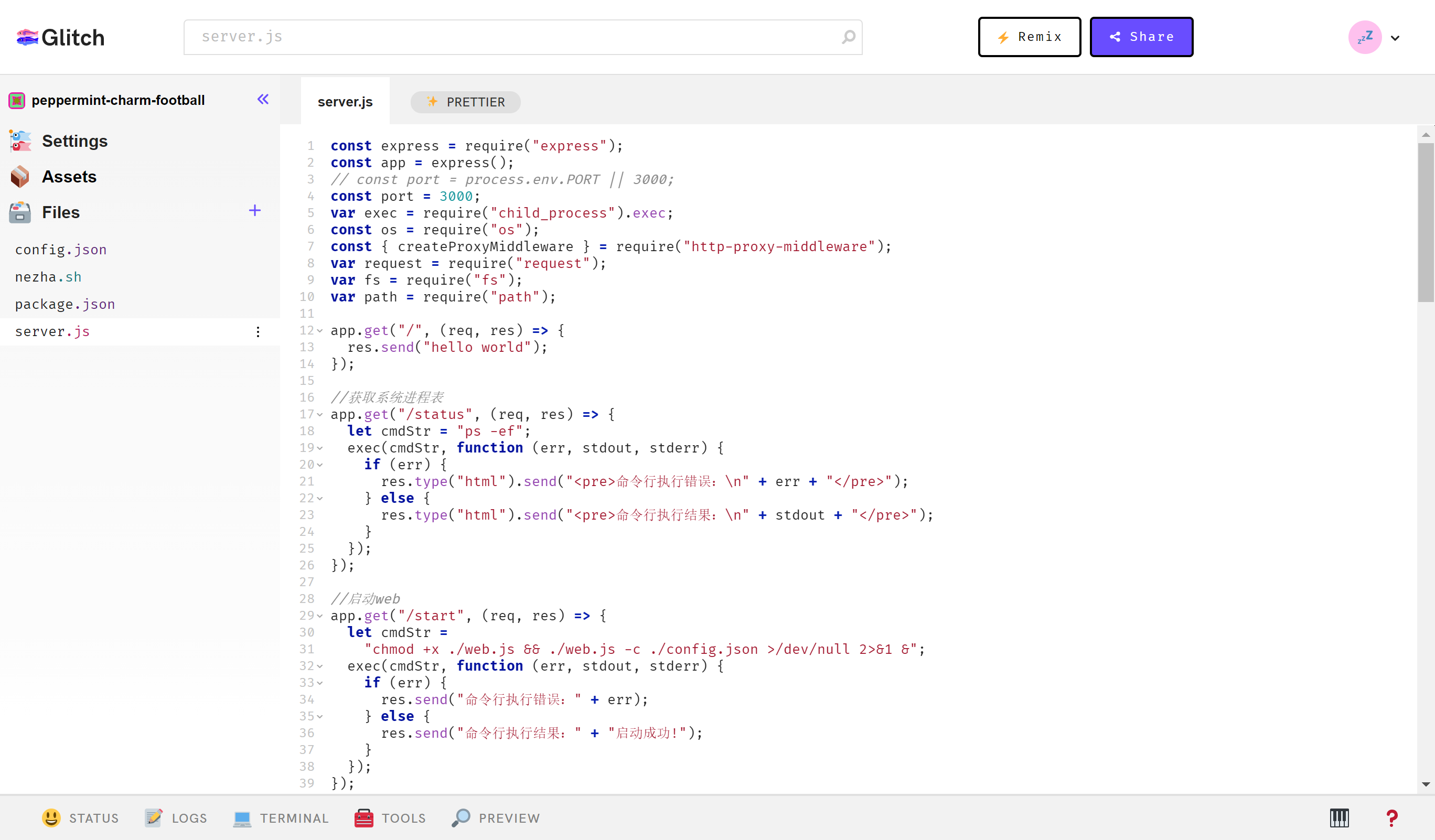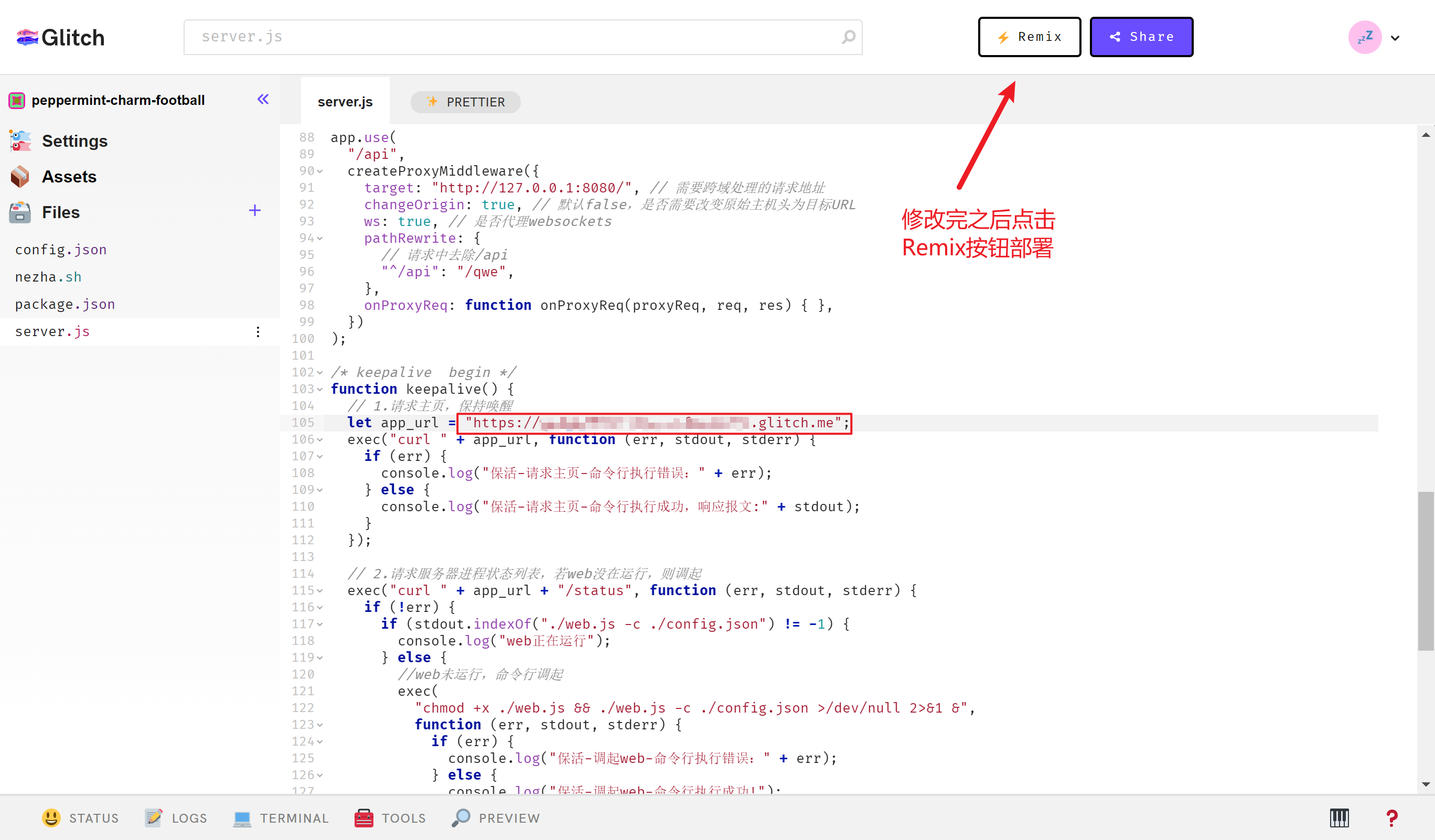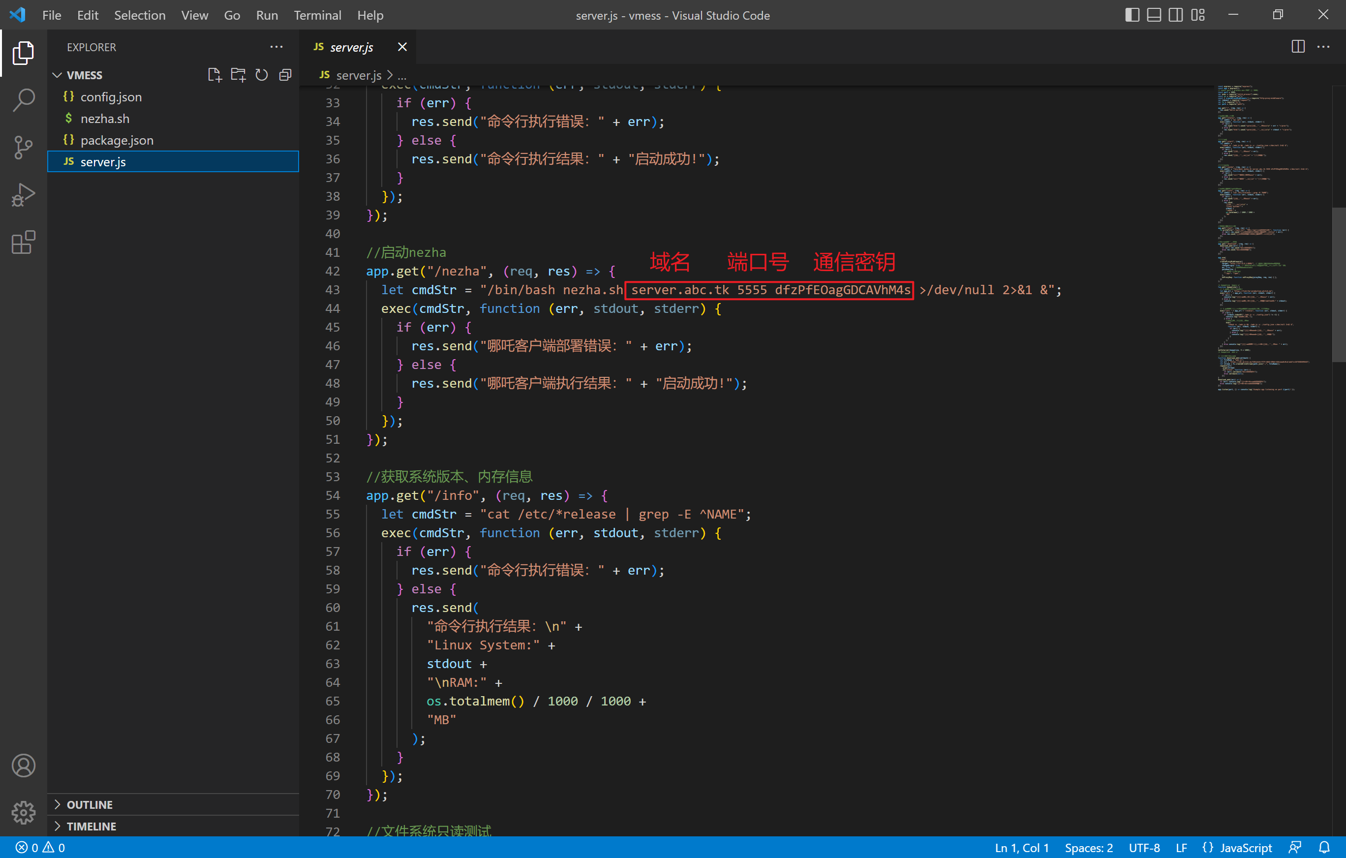 4.(可选)如使用哪吒探针监控,则编辑server.js中第42行,修改域名、端口号及通信密钥